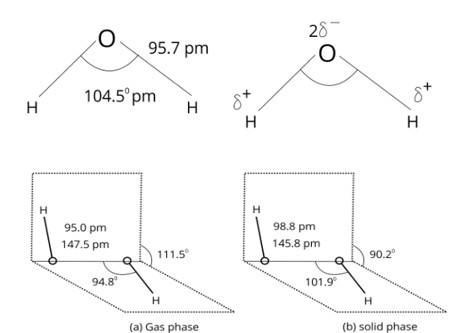9.53. In water molecule, O is SP3 hybridized. Due to stronger lone pair-lone pair repulsion than bond pair-bond pair repulsions, the H-O-H bond angle decreases from 109.5° to 104.5°. Thus, water is bent molecule.
