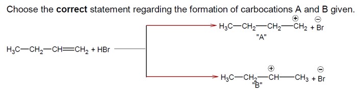 The 2° carbocation (B) is more stable than the 1° carbocation (A). Therefore, the activation energy (Ea) for the formation of B is lower, and B is formed faster.