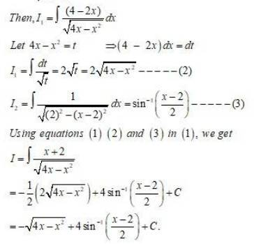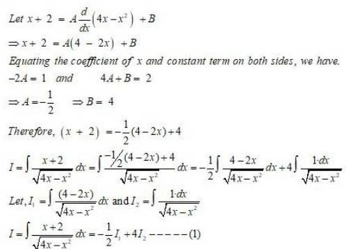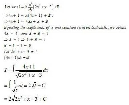 Equating thecoefficientofxandconstanttermonbothsides,wehave 5=6A;    and  2A+B=2 A= 56 B=22A B=113 Therefore,5x2=56(2+6x)+(113)I=5x21+2x+3x2dx=56(2+6x)+(113)1+2x+3x2dx=56(2+6x)1+2x+3x2dx11311+2x+3x2dxLet,I1=2+6x1+2x+3x2dxandI2=11+2x+3x2dxI=5x21+2x+3x2dx=56I1113I2(1)Let 1 + 2x+ 3x2=t