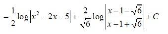 (2x2)dx=dtI1=dtt=log|t|=log|x22x5|(2)I2=1x22x5dx=1(x22x+1)6dx=1(x1)2(√6)2dx=12√6log(x1−√6x1+√6)(3)Substituting(2)and(3)in(1),wegetI=12log|x22x5|+42log|x1−√6x1+√6|+C