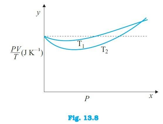 13.3 (a) The dotted plot in the graph signifies the ideal behaviour of the gas, i.e. = R, (where is the number of moles and R is the universal gas constant) is a constant quantity. It is not dependent on the pressure of the gas. The curve of the gas at temperature is closer to the dotted plot than the curve of the gas at temperature
