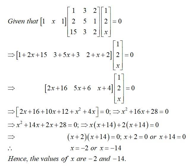 T h e g i v e n e q u a t i o n c a n b e w r i t t e n a s [ 2 x 2 2 x 3 x x 2 ] + [ 1 6 1 0 x 8 8 x ] = [ 2 x 2 + 1 6 4 8 2 0 1 2 x ] [ 2 x 2 + 1 6 a 1 2 3 x + 8 x 2 + 8 x ] = [ 2 x 2 + 1 6 4 8 2 0 1 2 x ] E q u a t i n g t h e c o r r e s p o n d i n g e l e m e n t s , w e g e t 1 2 x = 4 8 , 3 x + 8 = 2 0 , x 2 + 8 x = 1 2 x x = 4 8 1 2 = 4 , 3 x = 2 0 8 = 1 2 , x 2 = 1 2 x 8 x = 4 x x = 4 , x 2 4 x = 0 x = 0 , x = 4 H e n c e , t h e n o n z e r o v a l u e s o f x i s 4 .