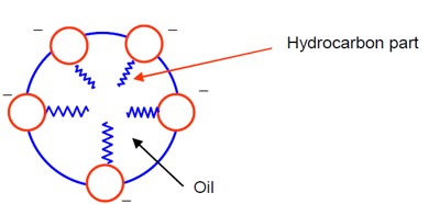 Spherical micelles forms and hydrocarbon part are water repelling and attracted by oily part.