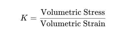 Bulk Modulus (K): It is used to measure the ability of the material to resist volume change when uniform pressure is applied to it. Mathematically, it is: