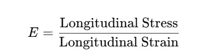 Young's Modulus (E): It is used to measure a solid's elasticity when longitudinal stress (tensile or compressive) is applied to it. Mathematically, it is represented by the following formula;