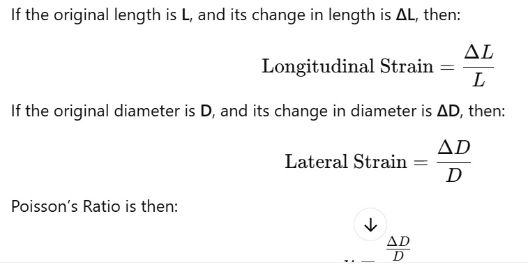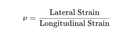 Poisson's Ratio (? ) is used when a material is subjected to axial stress. It is the ratio of lateral strain to longitudinal strain. Mathematically, it is: