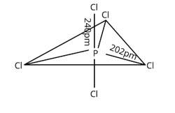 Three P—Cl bonds are arranged in one plane at a 1200 angle. These bonds are known as equatorial bonds because they are formed between two points. The remaining two P—Cl bonds, one above the equatorial plane and the other below it, form 90° angle with the plane. Axial bonds are the name for these types of bonds. Because axial bond pairs are subjected to greater repulsive interaction than equatorial bond pairs, axial bonds are slightly longer and hence slightly weaker than equatorial bonds, making the PCl5 molecule more reactive.