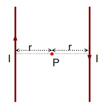 If currents are flowing in same direction, magnetic field will cancel each other, so the currents must flowing in opposite direction