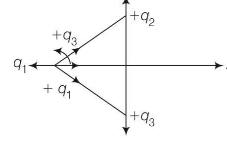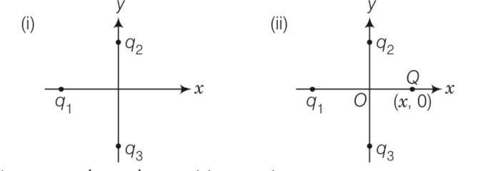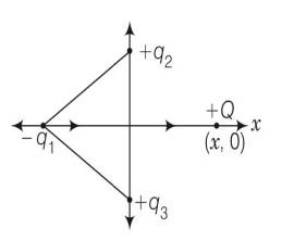 Explanation-The force between (q1, q2) and (q1, q3) is must be attractive to net forces act in positive direction of x . so q1 must be negative. But if we place a positive charge Q in positive direction of x then it must be attractive towards along x-axis. So it will be attractive towards positive x axis.