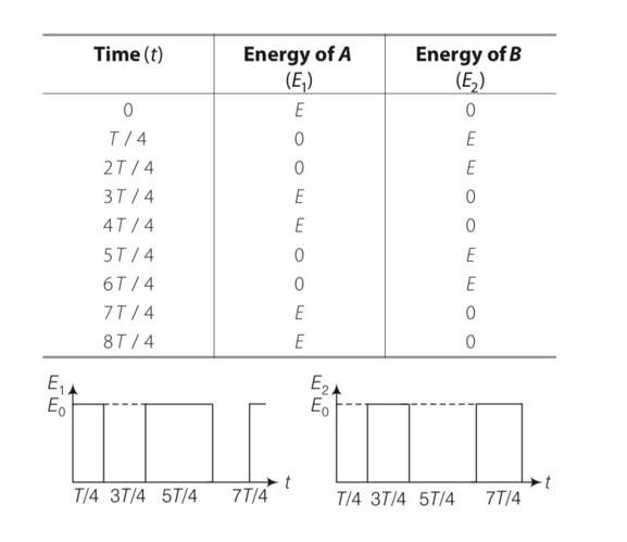 When B is released it strikes at A at t=T/4 in the head on elastic collision between B and A comes to rest and A gets velocity of B. therefore E1=0 and E2=E. at A =2T/4, B reaches its extreme right position when KE of A is converted into PE=E2=E . Energy of B, E1=0