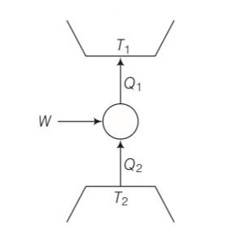 Heat is transferred to the gas in the small container by big reservoir at temperature T2