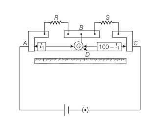 Explanation- In case of meter bridge, the resistance wire AC is 100 cm long. Varying the position of tapping point B, bridge is balanced. If in balanced position of bridge AB = l, BC = (100 – l) so that Q/P= (100-l)/l. Also P/Q=R/S=>S= (100-l)/l R