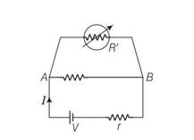 Explanation- potential drop across AB is independent to R' also when we decrease the value of R the current will also very large. According to the relation I=e/R+r
