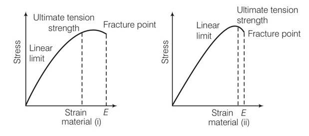 (c), (d) The ultimate tensile strength for material ii is greater hence material ii is elastic over larger region as compared to material (i) for material (ii) fracture point is nearer, hence it is more brittle.