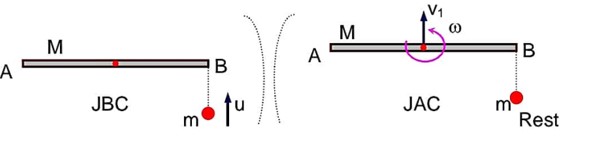 Using conservation of angular momentum about centre of mass of Rod, we can write