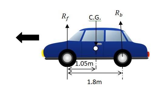 For rotational equilibrium around C.G. we have Rf x 1.05 = Rb x (1.8 – 1.05)
