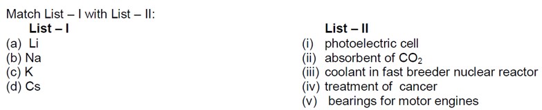 Li is used in making batteries, liquid Na is a coolant in nuclear reactors. Cs is used in photoelectric cells and KOH as a base is used to absorb acidic oxides like CO?