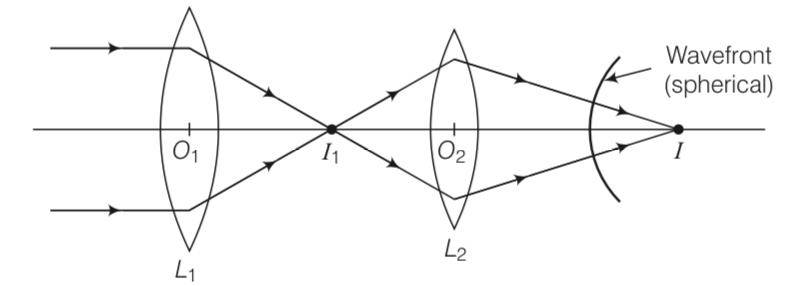 Explanation- The point image I1, due to L1 is at the focal point. Now, due to the converging lens L2, let final image formed is I which is point image, hence the wavefront for this image will be of spherical symmetry.