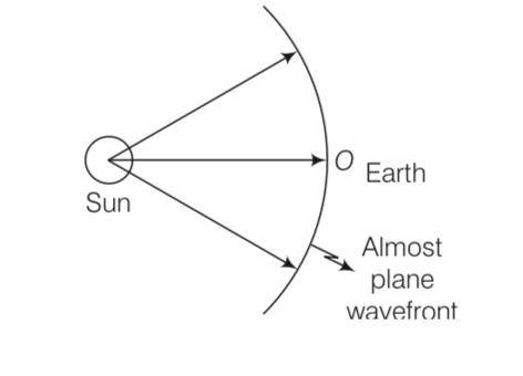 Explanation- We know that the sun is at very large distance from the earth. Assuming sun as spherical, it can be considered as point source situated at infinity. Due to the large distance the radius of wavefront can be considered as large (infinity) and hence, wavefront is almost plane.