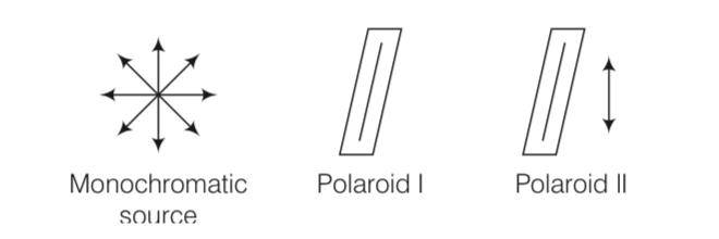 Explanation- As per the given question, monochromatic light emerging from polaroid (I) is plane polarised. When polaroid (II) is placed infront of this polaroid (I), and rotated till no light passes through polaroid (II), then (I) and (II) are set in crossed positions, i.e., pass axes of I and II are at 90°.