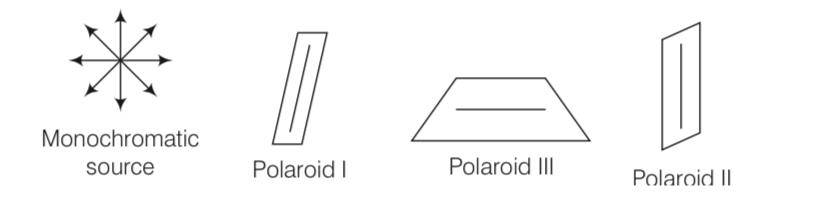 Consider the above diagram where a third polaroid (III) is placed between polaroid (I) and polaroid II.