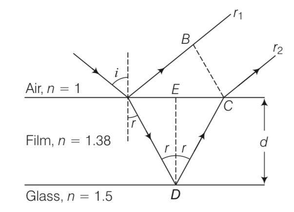 Consider a ray incident at an angle i. A part of this ray is reflected from the air-film interface And apart refracted inside.