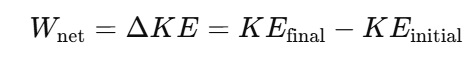 The work-energy theorem in Physics Work, Energy and Power refers to that net work done on an object is equal to its change in kinetic energy. The following is the formula: