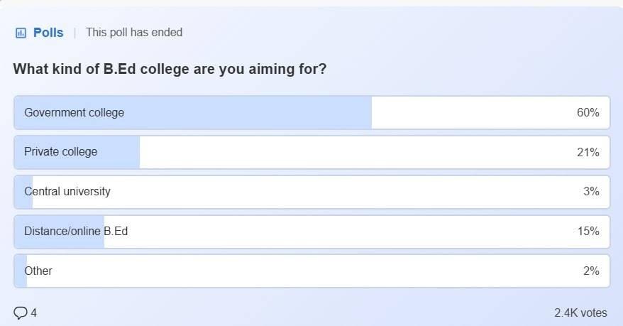 This poll highlights that the majority of students still believe government institutions are the most reliable path for their B.Ed journey, while private, central and Distance or Online options also have their own dedicated followers.