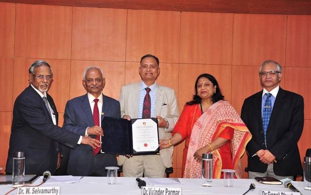 April 11, 2025: In recognition of its pathbreaking contributions in the domains of space research and defence innovation, Amity University has been honoured with a Prestigious Certificate of Appreciation, during the inaugural session of the 3rd edition of the Indian Defspace Symposium 2025, under the theme “Strengthening India’s Space Defence Foundations”, at the Manohar Parrikar Institute for Defence Studies and Analyses (MP-IDSA), New Delhi. The Certificate was presented by Dr Jayant Patil, Chairman ISpA and Lt Gen A K Bhatt, DG ISpA to Dr. W. Selvamurthy, President, Amity Science Technology and Innovation Foundation.