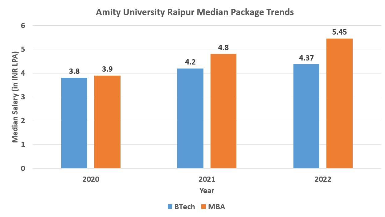 Coming to the median package trends, an improving trend was observed in the median package offered to BTech and MBA students passed out between 2020 and 2022 at Amity University Raipur. For more clarity check out the infographic below: