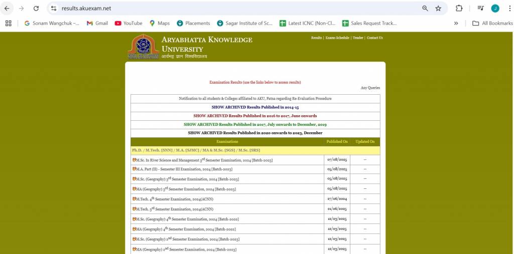 Aryabhatta Knowledge University (AKU), Patna Result 2025 has been released for MSc (Geography) and MA (Geography) 3rd Year Examination on August 05, 2025 at its official website. AKU Results for mid-semester and annual semester examinations are published 30-35 days after the completion of exams on its official website. Students are required to enter their registration number to download the results. The university accepts revaluation applications within 15 days of the declaration of the result.