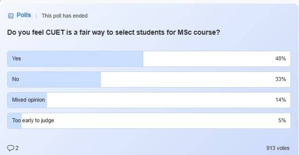 So, this was the poll analysis of how reliable the CUET PG entrance exam is for the MSc aspirants. We can see that 48% of the total voters find CUET PG to be a fair choice to select students for MSc courses. Whereas 33% of candidates do not think that it is a fair way for student selection to top colleges.