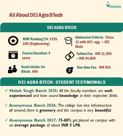 Aspirants must check out the course-specific eligibility criteria before applying for admission to this college for BTech. Dayalbagh Educational Institute BTech admission is provided based on JEE Main scores. For more information, mentioned below is the DEI Agra BTech infographic: