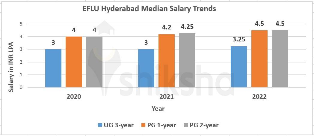 EFLU Hyderabad average package data is not released. However, according to EFLU Hyderabad NIRF report 2023, the median package offered during EFLU Hyderabad UG and PG placements 2022 stood at INR 3.25 LPA and INR 4.5 LPA, respectively. Further, an improving trend was witnessed in the UG and PG median package offered over the past three years during EFLU Hyderabad placements, which is presented below: