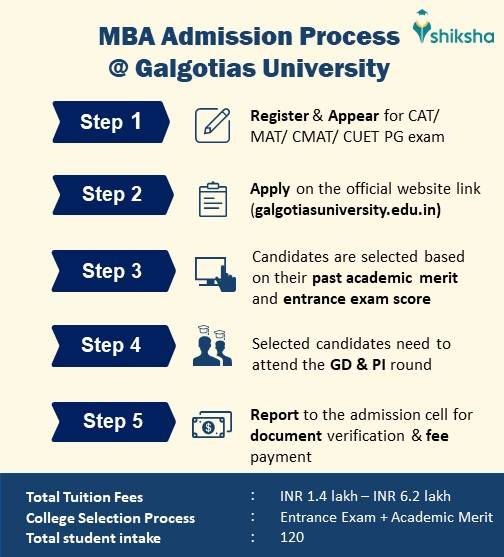 Admission to the Galgotias University MBA course is completely entrance-based. Candidates are admitted to this course via entrance exams such as CAT, MAT, CMAT, NMAT, and CUET PG. Candidates are selected based on their past academic merit and scores obtained in any one of the respective entrance exam. Those who hold a UG degree can apply for this course.