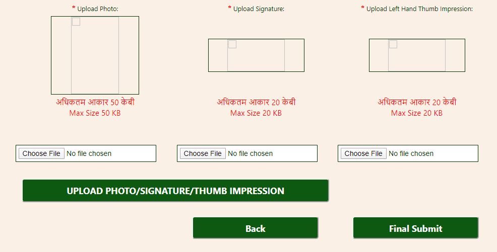 Step 2: Upload documents in Pantnagar University Entrance Exam Application - After filling all the details, candidates are required to upload their documents i.e. photograph, signature, and thump impression as under: