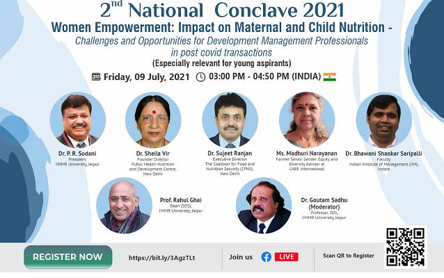 July 7, 2021: The second National Conclave 2021 on Women Empowerment: Impact on Maternal and Child Nutrition will be held at IIHMR University's School of Development Studies. The Coalition for Food and Nutrition Security is sponsoring this event, which will bring together experts from government, academia, and non-governmental organisations to discuss the challenges and opportunities in India's development sector, as well as how development management professionals can respond in the Covid era.