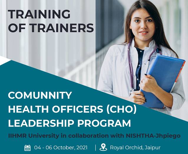 October 4, 2021: IIHMR University in collaboration with NISHTHA-Jhpiego is conducting a three-day programme - Training of Trainers from October 4 to October 6, 2021. These Trainers will also conduct a Leadership Certification Programme for 900 Community Health Officers from 14 states: Arunachal Pradesh, Assam, Sikkim, Meghalaya, Manipur, Mizoram, Nagaland, Tripura, Bihar, Jharkhand, Orissa, Uttar Pradesh, MP, and Chhattisgarh.