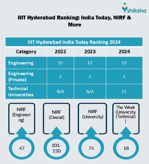 The 'Engineering' category rankings of the institute have shown a fluctuating trend when compared to last year's rankings. In 2024, IIIT Hyderabad fell 1 rank to #13 rank in the 'Engineering' category by the India Today ranking.