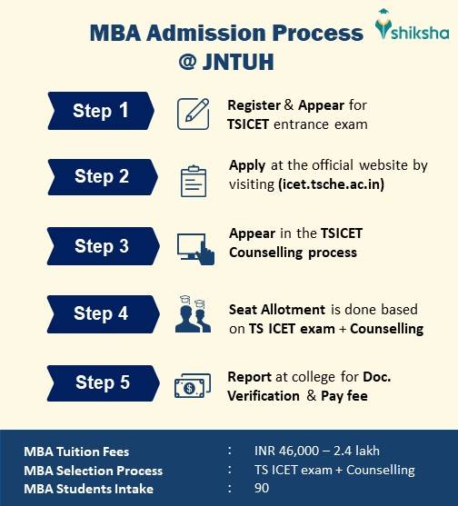 At the PG level, a full-time (Master of Business Administration) MBA course is offered at JNT University. Candidates who passed graduation in the relevant stream are eligible to apply for the course. Following that, candidates must also qualify for TS ICET exam to secure a seat in the MBA course. The exam is conducted by the Telangana State Council of Higher Education. Find the below infographic for JNTUH MBA admission 2025: