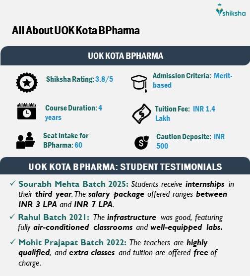 Kota University offers a regular Bachelor of Pharmacy (BPharma) course of four-year duration. Kota University also offers a Lateral Entry BPharma course of a three-year duration. The seat intake for both courses is 60 in total. Admission to BPharma and Lateral Entry BPharma is based on the merit score in the qualifying exam. For more information, candidates can refer to the following UOK Kota BPharma infographic: