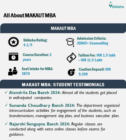 MAKAUT MBA is a two-year postgraduate programme offered by Maulana Abul Kalam Azad University of Technology. The programme is offered with three specialisations, a two-year MBA (general) programme, MBA in Business Analytics and MBA in Hospital Administration. However, more than 30 affiliated colleges of MAKAUT also offer MBA programmes across numerous specialisations. The below mentioned infographic contains more information about the MBA at MAKAUT programme including fees, reviews, seats, and more: