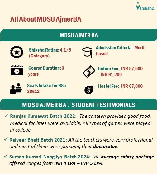BA at MDSU Ajmer is a three year long programme. It is offered accross various specialisation across multiple affiliated colleges, such as BA (Hons.) Economics. Candidates who have a minimum aggregate of 45% in Class 12 are eligible for admission into the programme. Candidates can find below the MDSU BA infographics for more details: