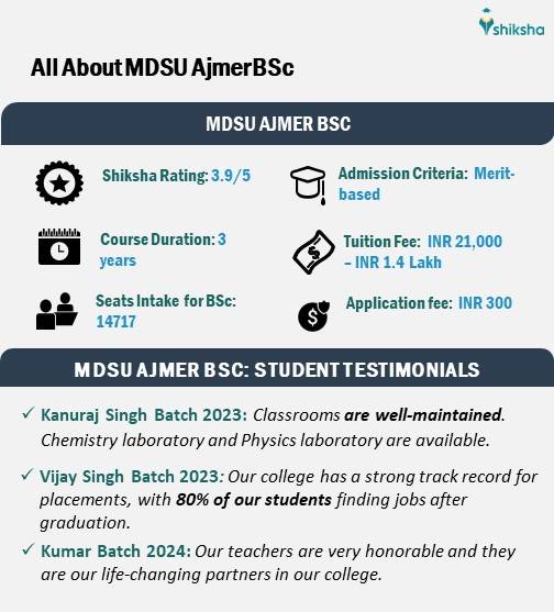BSc at MDSU Ajmer is offered as UG courses namely BSc programme and BSc (Hons). The BSc programme is offered in two specialisations whereas BSc (Hons) is offered in one specialisation. Apart from this, the university offers BSc in various specialisations through its affiliated colleges. Candidates can find below the MDSU Ajmer BSc infographic for more information: