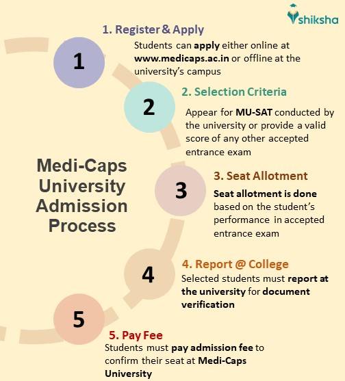 To get admission into any of the programmes offered at Medicaps University, students are required to qualify for the admission criteria as set by the university. Eligible students can apply for the course of choice by filling out the application form and providing the required documents. Aspirants looking to enrol Engineering, Management, Agriculture, Pharmacy, Science, and Art Humanities, Social Science, and integrated Law courses need to appear for the MU-SAT exam or provide a score of other accepted exams. For final seat confirmation, students need to pay the admission fees.