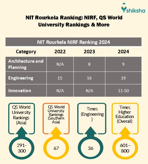 Ranking bodies, including NIRF, QS World University Rankings, Times Higher Education, US News, Times, etc. have acknowledged NIT Rourkela for its outstanding academic performance across various categories. Refer to the table below for more information on NIT Rourkela - National Institute of Technology ranking achievements.