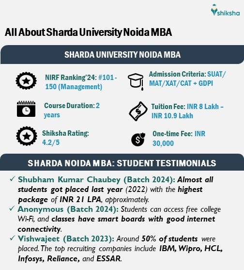 Sharda University offers a full-time MBA under various specialisations. The duration of the programme is two years. MBA at Sharda University is offered in eight specialisations. These specialisations included Banking and Finance, Healthcare and Hospital Administration, Business Analytics, Marketing Management, etc. Additionally, the university provides an MBA (Dual Specialisation) and an Executive MBA programme (for working professionals). Check out the following infographic containing more information about Sharda University's MBA course: