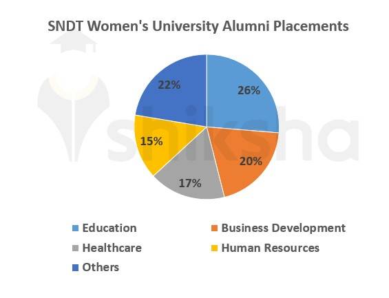 As per the unofficial sources, a major portion of SNDT Women's University alumni are placed in the Education sector (26%), followed by Business Development (20%) and Healthcare (17%). The pie chart below illustrates a sector-wise bifurcation of SNDT Women's University alumni placements throughout the years: