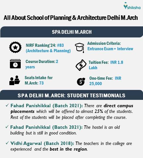 M.Arch at SPA is a full-time PG-level course of a two-year duration. Under this programe, the college offers M.Arch in three specialisations, including Architectural Conservation, Landscape Architecture, and Urban Design. Check out the following infographic on the SPA Delhi M.Arch course: