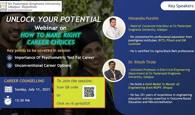 July 12, 2021: Udaipur based SPSU - Sir Padampat Singhania University recently hosted a webinar on ‘How To Make Right Career Choices’ with an aim to help fresh Class 12 pass out students to make the right and sound decision for their career. The webinar focused on –